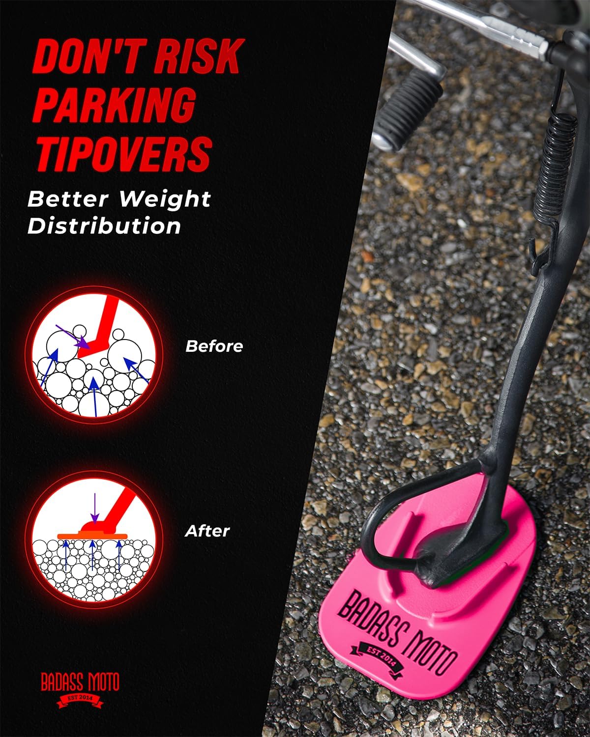 - MOTORCYCLE KICKSTAND PAD: Never worry about your motorcycle tipping over This Heavy Duty motorcycle kickstand pad prevents tip-overs by stopping your kickstand from sinking into hot asphalt, soft grass, gravel, sand, or dirt. The kickstand plate effectively distributes your motorcycle's weight over a larger surface area, giving you assurance when parking almost anywhere. This premium motorcycle kickstand coaster pad is ideal for for large touring motorcycles, cruisers, and sportbikes.